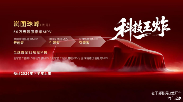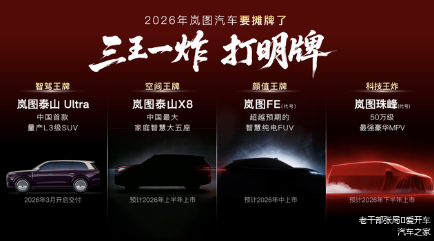 1月28日,岚图汽车官宣了2026年将投放的四款新车,形成“三王一炸”。其中一款为泰山顶配车型Ultra,另外三款为全新车型,包括“五座版泰山”的泰山8X、定位高端纯电轿跑SUV的代号为FE的全新车型,以及比梦想家更高端的代号为“珠峰”的全新MPV。