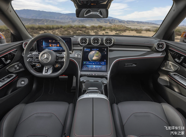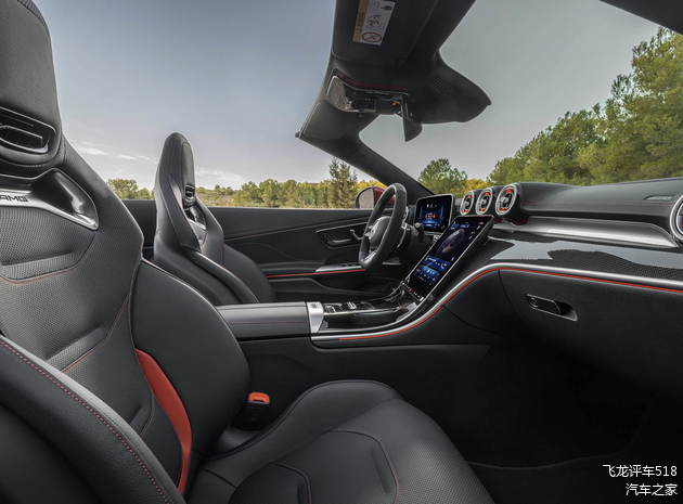 梅赛德斯-AMG CLE Mythos车内更加硬核,采用了大面积黑色Nappa真皮材质,还加入了手工菱形缝线设计,前排配备了两个符合人体工程学设计的赛车桶装座椅,宽大厚实的侧翼提供了更好的包裹和支撑。双门设计虽然外观优雅,却让后排乘客上下车变得有些困难。后排空间比较紧凑,只能适合短途乘坐。中控台配备了AMG提供了小尺寸赛车方向盘和大尺寸银质换挡拨片,操控岛区域变得更加简约。科技感方面,该车还配备了12.3英寸的LCD全液晶仪表和12.8英寸的中控液晶大屏,柏林之声Hi-End 3D环绕声系统。