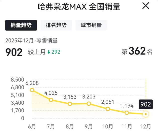 车卖家查了一下第三方媒体平台公布的销量数据,12月份哈弗枭龙MAX的销量为902辆,也就是说销量已经低于1000了,这个估计让很多人都没有想到,毕竟二代哈弗枭龙MAX的产品力确实还是有的,说实话车卖家也没想到销量会跌到1000辆以下!