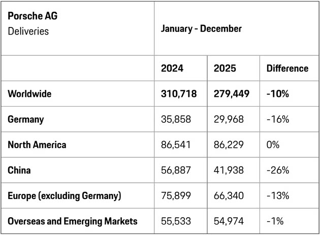 2025年,保时捷全球交付27.94万辆,同比下滑10%;其中,中国市场交付4.19万辆,同比大幅下降26%。