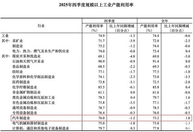 2025年,中国汽车制造业产能利用率为73.2%,同比增长1%,较2024年略好;但仍低于工业整体74.4%的产能利用率。