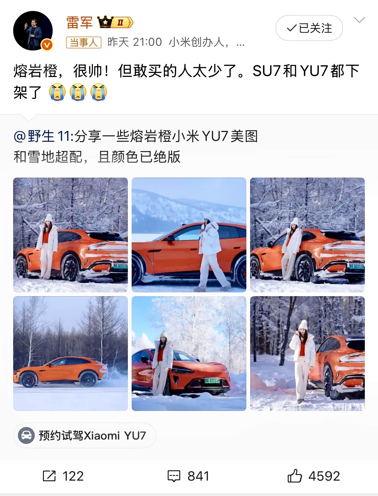 雷军在微博坦言:小米SU7和YU7的熔岩橙配色,因实际下单的人太少,不得不下架,虽然好看,但大家却不敢买。 很多人嘴上夸熔岩橙“惊艳”“有豪车感”,真到掏钱时,却默默点了白色或寒武岩灰。不是不喜欢,而是顾虑太多——太高调怕成“显眼包”,补漆贵、保值低、日常打理麻烦……甚至有人笑称:“总觉得这颜色太耀眼。
