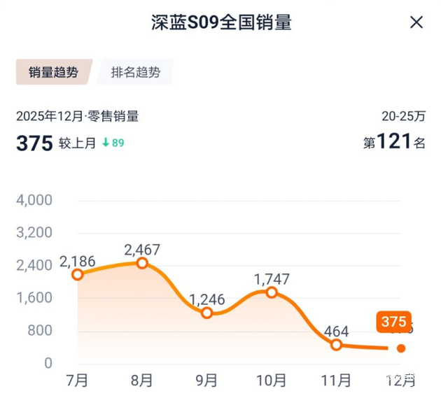 数据显示,其12月销量375台,11月销量464台,10月销量1747台,9月销量1246台、8月销量2467台、7月销量2186台。