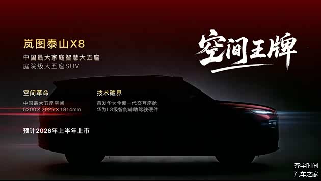 岚图全新推出的“庭院级大五座SUV”岚图泰山X8,致力于构建一个“可移动的家庭生活空间”,为中国家庭用户提供空间体验与智能出行解决方案。该车车长5200mm,宽2025mm,高1814mm,是“国内最大家庭智慧大五座SUV”,宽敞座舱设计可满足儿童自由活动、长辈舒适休憩等多元家庭出行需求,真正实现“无束缚”的全家旅程。在智能化方面,岚图泰山X8将搭载华为最新一代智能座舱系统,并配备L3级智能辅助驾驶硬件,进一步强化其在高端新能源SUV市场的核心竞争力。该车型将于2026年上半年正式上市,是岚图扩充SUV产品矩阵的重要车型。