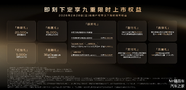 银河V900指导价30.98万—36.98万,上市权益中,超级置换2万,超级购置税补贴15000,新春红包5000,加一起是4万。所以当下这款车的价格是26.98万—32.98万,当然了,这个你就当作是这款车的最终价格就行了。另外赠送价值1万的电动脚踏板。中高配赠送27个扬声器的音响。典藏版还会赠送纯金徽标,还赠送充电桩。剩下的权益都非常常规,不再赘述。