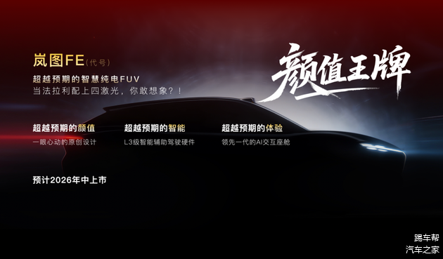 岚图汽车称,FE将会带来“超越预期的颜值”、“超越预期的智能”和“超越预期的体验”, 该车采用极具视觉冲击力的先锋运动造型、L3及智能辅助驾驶硬件和领先一代的AI交互座舱,成为年轻用户获得高端智能驾乘体验的一款新选择。