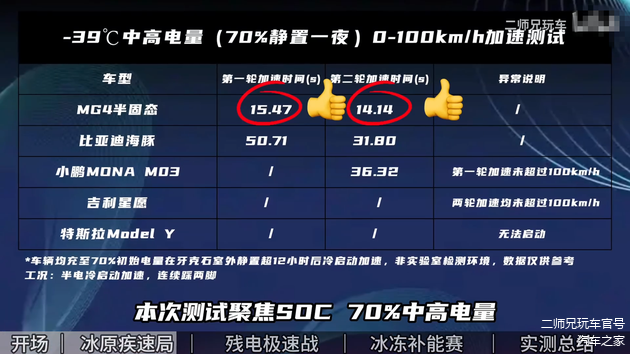反观MG4半固态安芯版,这款车在70%电量下,在零下三十多度的环境中测试零百加速,这款车在冷车的情况下,破百时间也只需要15秒多;而在热车之后,它的加速时间还会逐渐缩短。