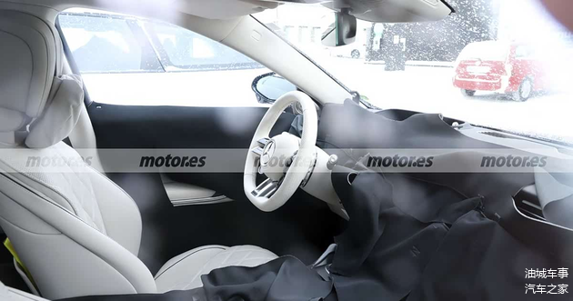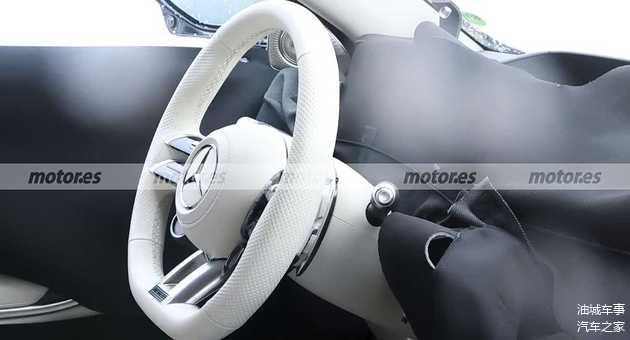 内饰目前仍覆盖着严密的伪装材料,仅能观察到部分细节。座椅造型与现款基本一致,侧向支撑结构宽大,表面采用菱形格纹路装饰,延续了运动氛围与豪华质感的结合。方向盘配备了铝制换挡拨片,局部可见白色皮革材质包裹,呈现出精致的触感。至于仪表盘和中控通道区域的具体设计,目前仍被遮盖,难以窥得全貌。