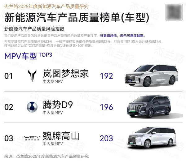 【CNMO科技消息】近日,独立研究机构杰兰路发布了《2025年度新能源汽车产品质量研究》报告。在竞争激烈的MPV细分市场中, 岚图梦想家以192分的质量风险指数位列第一,成为该领域可靠度表现最稳定的车型。腾势D9与魏牌高山分别以196分和203分的指数紧随其后。