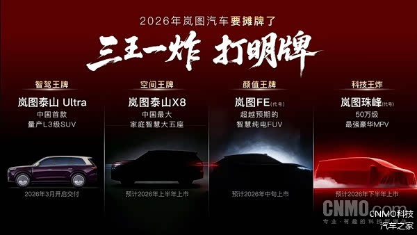 面向未来,岚图汽车已规划了密集的产品攻势。公司计划在2026年推出四款全新车型,包括将于3月率先交付的首款量产L3级SUV岚图泰山Ultra、定位大五座的岚图泰山X8、智慧纯电FUV岚图FE(代号),以及定位于50万元级豪华市场的MPV岚图珠峰(代号)。值得注意的是,这四款新车均将搭载L3级智能驾驶硬件。随着新产品矩阵的完善,岚图品牌在高端新能源市场的覆盖广度与竞争力将得到进一步强化。