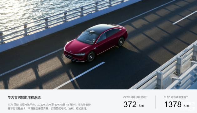 • 增程版:搭载华为雪鸮智能增程系统,增程器静音启停,亏电油耗低至 5.85L/100km,-40℃低温可稳定启动。CLTC 综合续航最高 1378km,纯电续航250km+,日常通勤零油耗,长途自驾无焦虑,加油即走,没有补能等待。