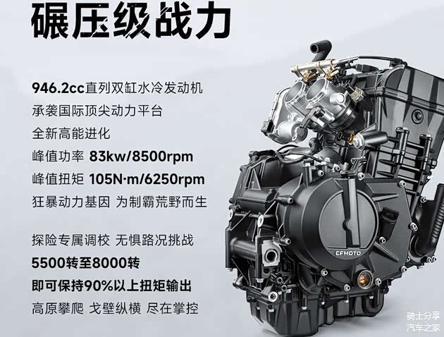 该车所搭载的是一款直列双缸水冷电喷发动机,它实际排量946.2cc,最大功率83KW,最大扭矩105N·m,该引擎会更加注重低扭释放,在5500rpm时就能逐步发力,并将配套博世9.0电喷系统。
