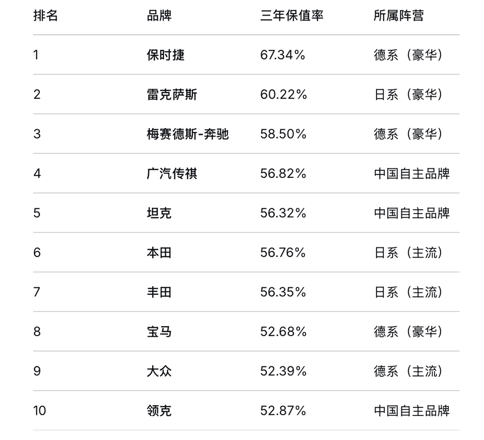 2025年度中国汽车三年保值率报告公布,国产在在前十中,只占3席 品牌三年保值率排名: 1.保时捷(67.34%); 2.雷克萨斯(60.22%) 3.奔驰(58.50%); 4.广汽传祺(56.82%); 5坦克(56.32%);