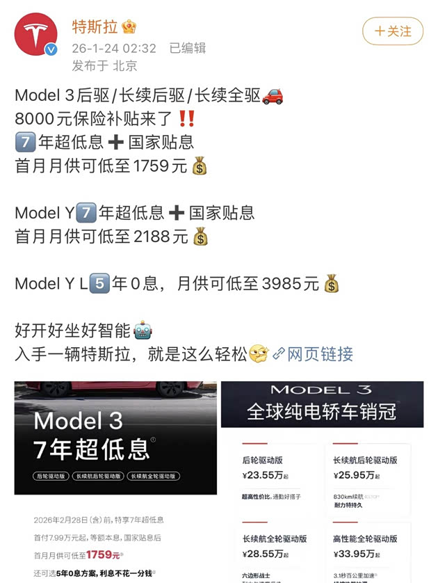 特斯拉的销售策略,向来有点“我行我素”的味道。它很少盲目跟风,总是按自己的节奏出牌。选择在年初这个传统车市淡季搞促销,意图再明显不过:就是要给略显平淡的市场直接“上强度”,把开年的销量热度撑起来。