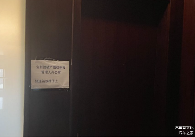 经走访,该人士发现总部办公区更是人去楼空,前台无工作人员值守,部分办公室门敞开着,散落着废弃的文件和办公用品。前往15楼的办公区,他发现墙上已被贴上了“宝利德破产债权申报管理办公室”的标志,相关破产管理人已进驻办公。