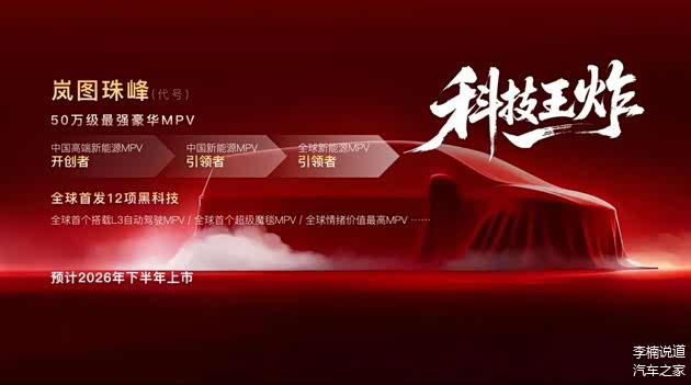作为中国高端新能源MPV的开创者,岚图汽车始终以代代领先为标准,推出的岚图梦想家稳居高端MPV销量冠军,并在2024年、2025年蝉联MPV用户净推荐值第一。2026年,岚图汽车将完成MPV系列化布局,重磅加推一款“50万级最强豪华MPV”,代号“珠峰”,与岚图梦想家形成组合,剑指全品类MPV销冠及全球新能源MPV引领者地位。该车型将全球首发12项黑科技,是全球首搭L3级自动驾驶MPV和情绪价值最高的MPV,将实现智能化、人车交互与豪华体验的全面引领,重新定义MPV的价值天花板。该车型将于2026下半年上市,成为岚图汽车夯实MPV领导地位的核心力作。