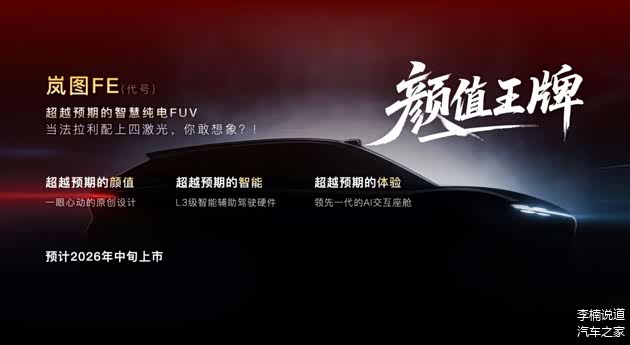 作为一款超越预期的智慧纯电FUV,岚图FE(代号)以超越预期的造型设计,赋予车型个性化的情感化表达,满足年轻用户独特的审美需求。此外,它将配备四激光雷达感知系统,搭载L3级智能辅助驾驶硬件,以及领先一代的AI交互智能座舱,为用户提供超越预期的智驾,和超越预期的AI交互体验。该车型将于2026年中旬上市,邵明峰表示:“岚图FE是岚图与华为乾崑的一次联手合作的全新起点,它不只是心中的热爱投射,更是一次彻底‘叛逆’,此款车型将科技的魅力与最原始的热爱融合一体,将成为年轻人心中的 Dream Car。”