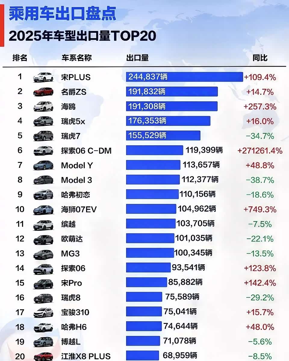通过数据很容易看出,比亚迪宋PLUS以244837辆的出口量排名榜单第1位,同比增长109.4%,是出口量唯一突破20万辆的车型,展现出了极强的国际竞争力。