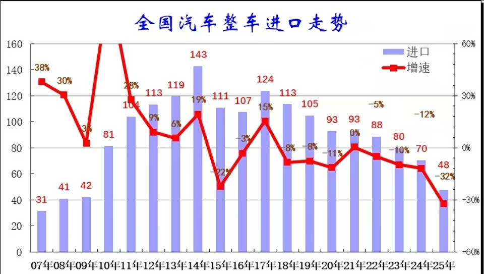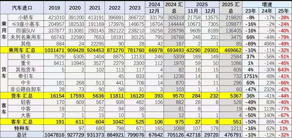 中国人今年豪华进口车少买了20万辆!BBA 保时捷全都线下滑,只有一个品牌逆势增长!2025年中国汽车进口量只有47.57万辆,同比大跌32%,这也是进口车市场连续第七年出现负增长,对比2014年的143万辆,十二年里市场规模几乎萎缩了三分之二,少了近百万辆。