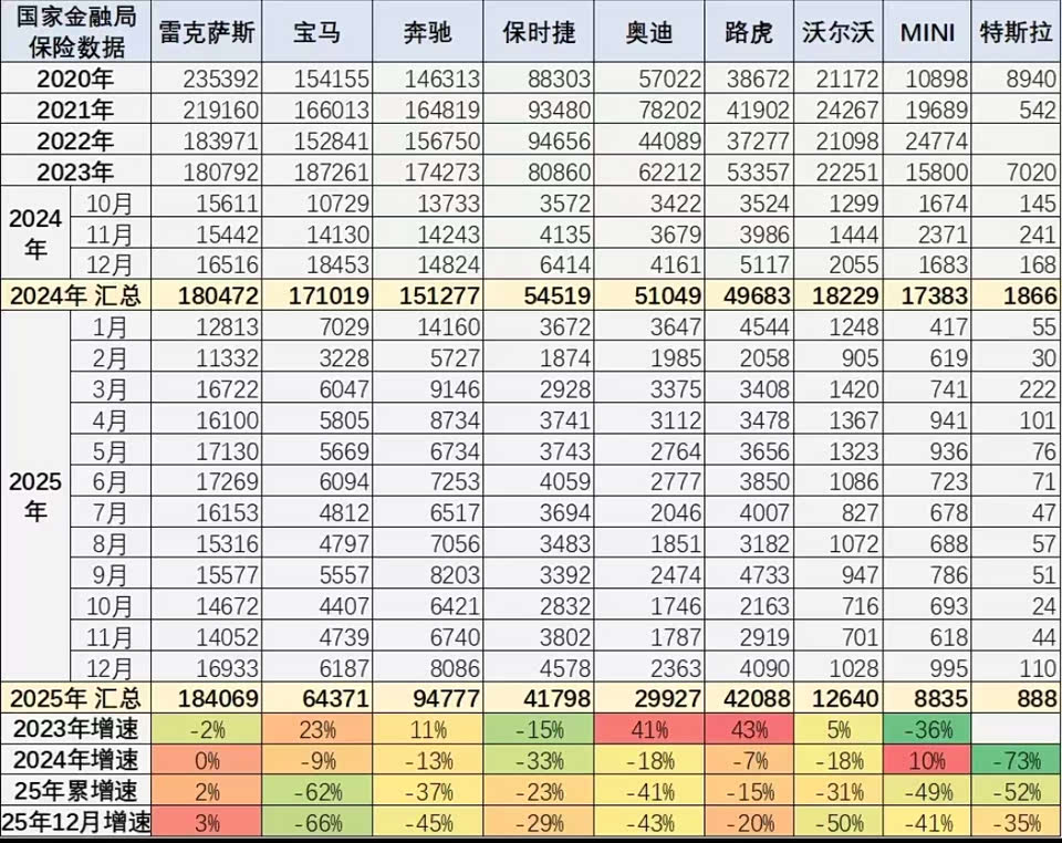 德系豪华品牌和超豪华品牌在进口车市场的寒冬里日子都不好过,德系三强BBA的进口量都在大幅萎缩,宝马下滑62%幅度最大,比去年少卖了10万辆,奔驰、奥迪也分别下滑37%和41%,少卖了5.6万和2.1万辆;保时捷同样连续三年下跌,2025年进口量下滑23%,整个进口豪华车市场都面临着明显的衰退压力。