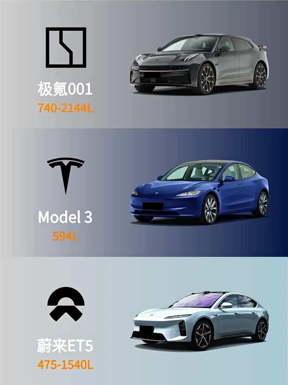 1️⃣ 空间王者:极氪001猎装造型后备箱740L,轻松塞下4个28寸行李箱;Model 3后排顶头,ET5溜背设计牺牲头部空间。