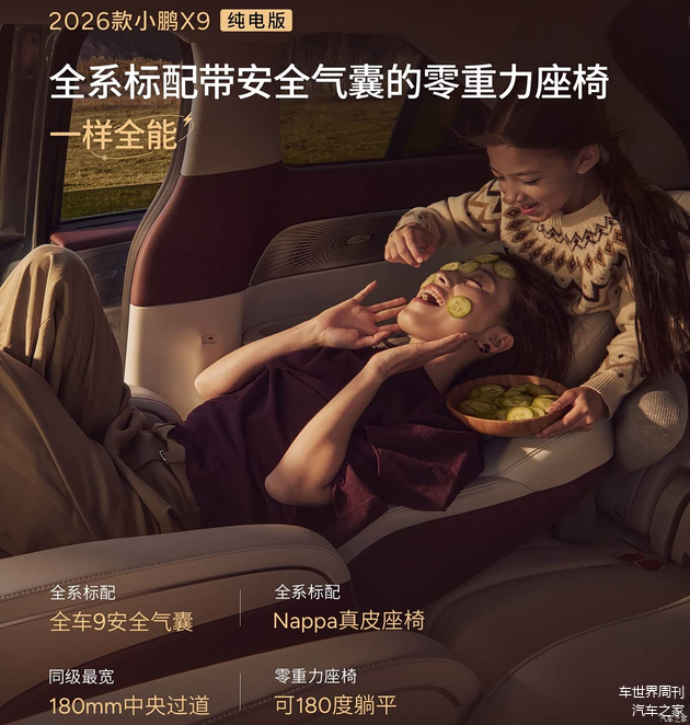 乘坐部分,2026款小鹏X9纯电动版全系标配Nappa真皮座椅,提供三排电动三折叠座椅,零重力座椅可实现180度躺平,中央过道宽度可达180mm,并且可以变换出四座/五座/六座/七座模式,无论是户外露营、车内小憩还是全家出行都能轻松满足。而且,新车还将提供RNC主动降噪、全车9安全气囊等功能配置,全面保障用户驾乘体验。