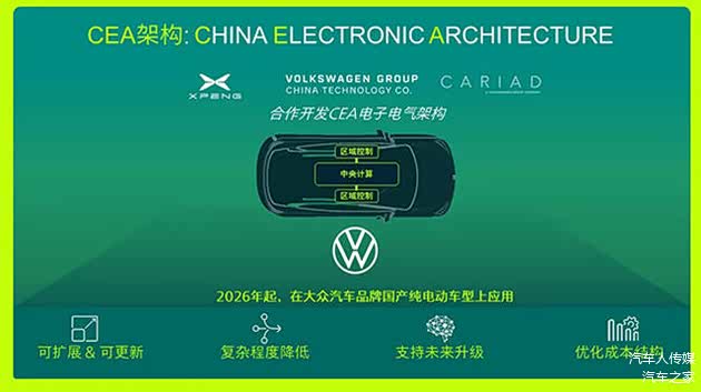 由大众汽车(中国)科技有限公司VCTC、CARIAD中国,与小鹏汽车联合研发的CEA架构,18个月时间就跑完从概念到量产的全流程,创下集团全新架构的最快研发纪录。