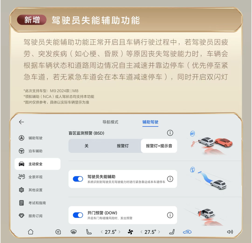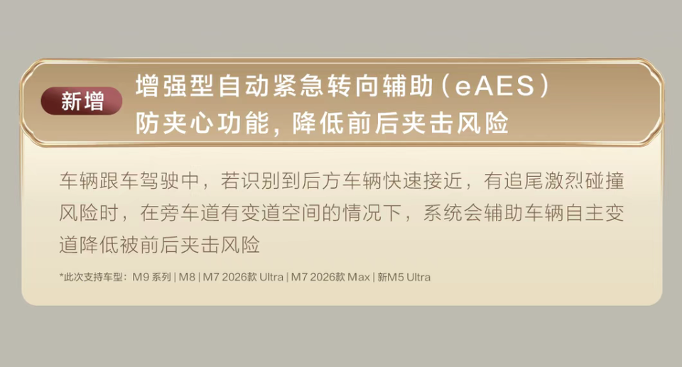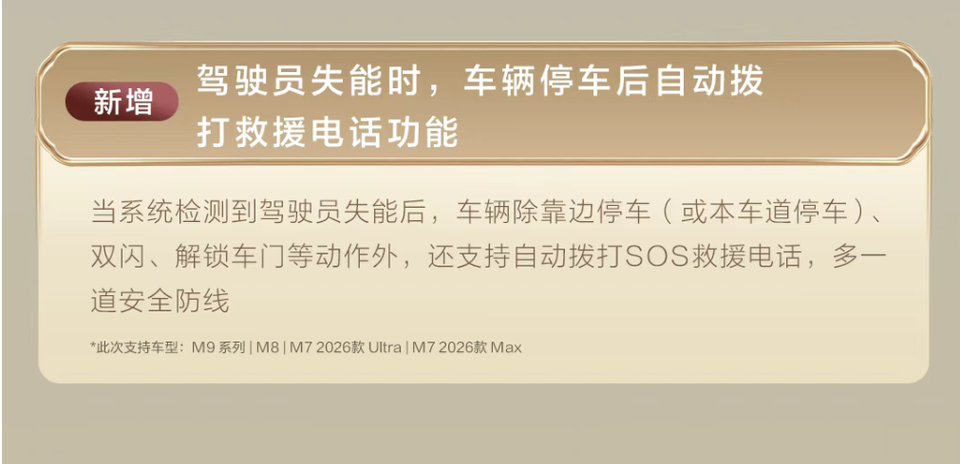 今早问界发布全系车型辅助驾驶相关的新年OTA升级公告,部分车主已经下载安装。细看了下,有三个核心新增功能。 1、三点式掉头,NCA状态掉头空间不够,车辆可以自行倒车腾挪空间。 2、增强型自动紧急转向辅助(eAES),跟车驾驶过程中,检测到后方车辆有碰撞风险、旁车道有空间情况下,可自行变道规避碰撞。 3、驾驶员失能辅助,驾驶员疲劳或突发疾病丧失驾驶能力时,车辆会自主靠边停车,打开双闪,同时呼叫救援。