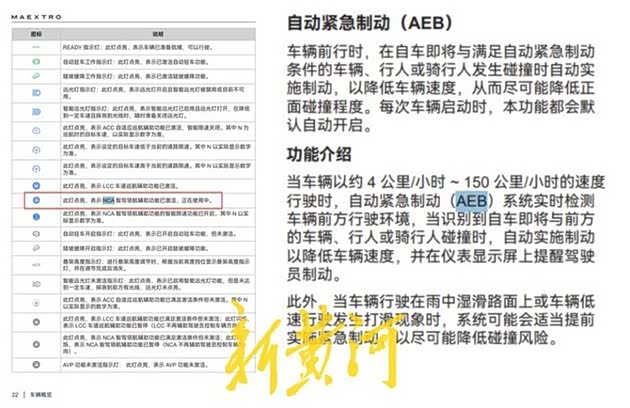 记者还查询了尊界汽车的说明书,NCA处于点亮状态表明“智驾领航辅助功能已激活”;AEB功能表明车辆在以约4公里/小时~150公里/小时的速度行驶时,当识别到自车即将与前方的车辆、行人或骑行人碰撞时,自动实施制动以降低车辆速度,并在仪表显示屏上提醒驾驶员制动。