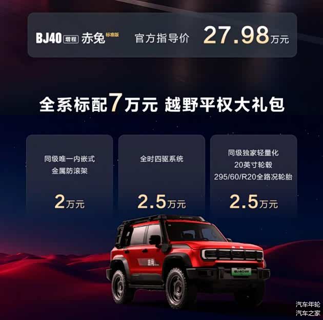 BJ40增程赤兔标准版官方指导价27.98万元!购车即可享有价值7万元的“越野平权大礼包”,包含价值2万元的同级唯一内嵌式金属防滚架、价值2.5万元的全时四驱系统和价值2.5万元的同级唯一轻量化20英寸轮毂与295/60 R20全路况轮胎。