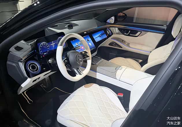 车身侧面,新车保持优雅修长的线条,隐藏式门把手得以保留,并换装全新造型的20或21英寸轮圈。新增“Mercedes-Benz”迎宾光毯,并提供黑色星空、绿砾石银等高定车漆,进一步强化尊贵气质。尾灯内部加入三枚星徽元素,与前大灯呼应,后包围的镀铬饰条和扩散器造型也做了调整。