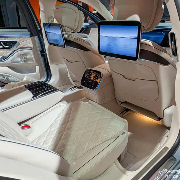 车内运用了新的设计,科技感表现非常出色,基于MB.OS架构,提供智能辅助驾驶、智能座舱等。配置有12.3英寸仪表屏幕,还搭载了14.4英寸中央触控屏,配置有最新的MBUX智能人机交互系统,还提供12.3英寸副驾驶屏幕,科技感非常强,后排配备“头等舱座椅”,提供最大43.5度的靠背调节与50度的腿托角度,后排配置有高清摄像头的13.1英寸显示屏。奔驰S级提供10个外部摄像头,标配MB.DRIVE辅助驾驶。