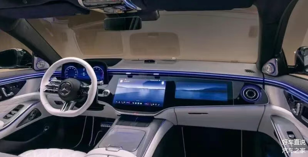 内饰上,新一代 S 级前排仪表台全新升级,整体式玻璃面板将 14.4 英寸中央触控屏与 12.3 英寸前排乘客屏融合成一体式 “超级屏”。前排乘客屏配备搭载双视区光学控制技术的隐私模式,既为副驾提供独立娱乐体验,又能避免驾驶者分心,提升行车安全。