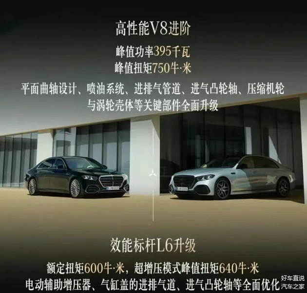 新一代 S 级全面优化动力总成,实现强劲性能、卓越能效与极致静谧的三重兼顾;底盘系统同步完成智能升级,新增路面记忆与预瞄调节的智能功能。全新 M 177 Evo V8 高性能发动机峰值功率提升 25 千瓦至 395 千瓦(537 马力),可在 2500-4500 转 / 分的宽泛转速区间输出 750 牛・米峰值扭矩,启动瞬间便能迸发充沛动力。