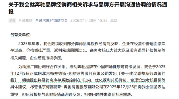 2025年12月9日,商会正式致函北京梅赛德斯-奔驰销售服务有限公司(奔驰中国),提出将经销商库存系数控制在1.0以内、优化返利机制、合理设定考核目标等具体建议。奔驰中国虽在12月26日回函表示“高度重视”,但据后续经销商反馈,“相关问题并未得到相应解决”。
