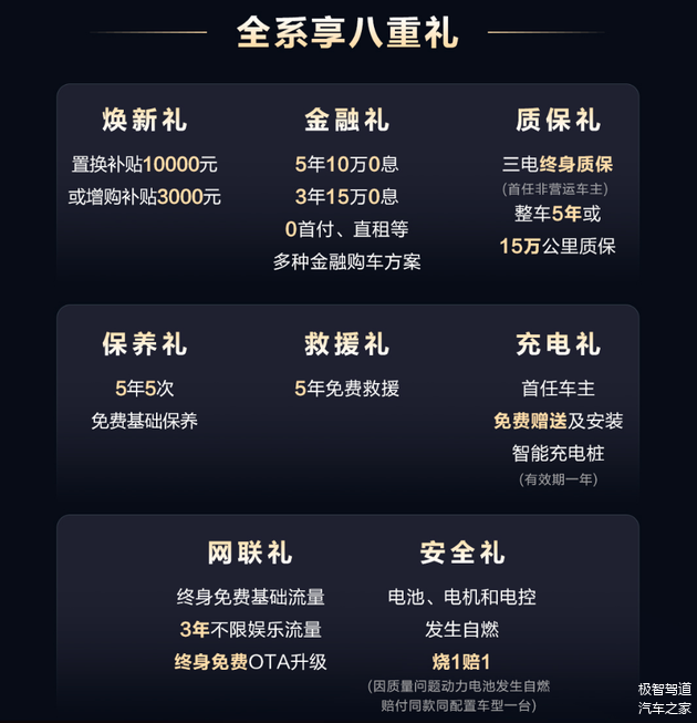 第八重,安全礼:电池、电机和电控发生自燃,烧1赔1(因质量问题动力电池发生自燃赔付同款同配置车型一台)。