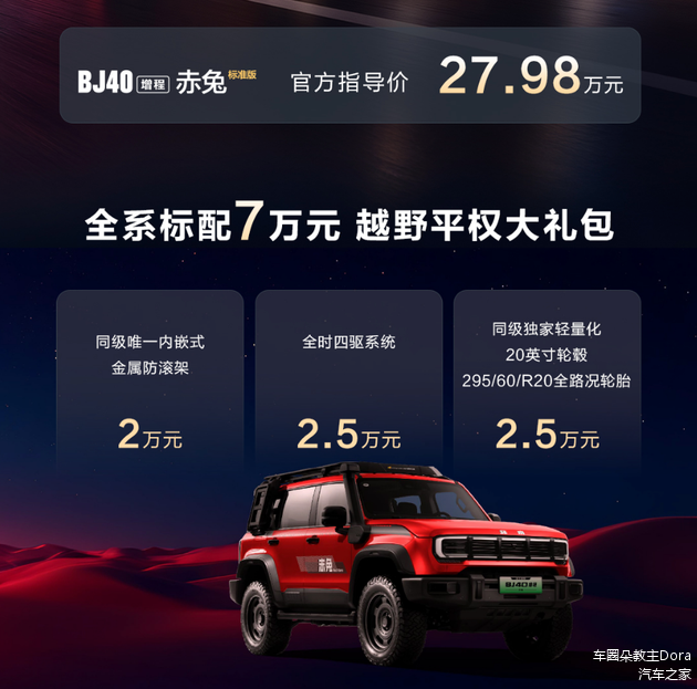 BJ40增程赤兔标准版官方指导价27.98万元!购车即可享有价值7万元的“越野平权大礼包”,包含价值2万元的同级唯一内嵌式金属防滚架、价值2.5万元的全时四驱系统和价值2.5万元的同级唯一轻量化20英寸轮毂与295/60 R20全路况轮胎。