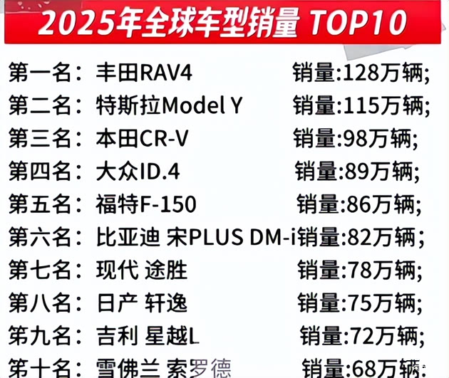 2025年全球单一车型SUV销量榜单出炉,丰田 荣放以128万辆的成绩登顶全球第一,力压特斯拉Model Y的115万辆,把靠“颠覆者”标签吸粉的特斯拉,按在了销量榜单的第二名。