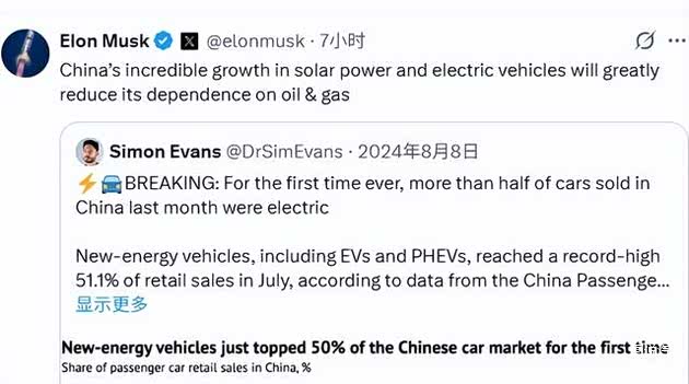 马斯克在自己的社交平台上回复了一个博主的话称:中国太阳能和电动汽车的惊人增长将大大降低其对石油和天然气的依赖。