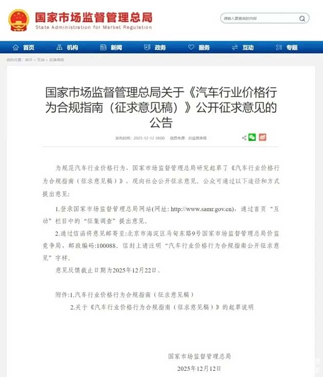 事实:12月12日,国家市场监督管理总局发布了《汽车行业价格行为合规指南(征求意见稿)》,指出企业要建立以生产成本为基础、市场供求为导向的定价策略,汽车生产企业不得以排挤竞争对手或者独占市场为目的,实施不正当价格竞争行为。