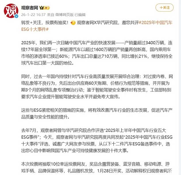 新年伊始,华汽研究院与观察者网合作,共同发起“2025年中国汽车行业ESG十大事件”评选活动。评选活动分为专家评选和网络投票。