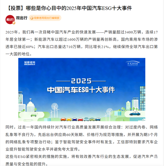 1、华汽研究院微信公众号:格局与趋势|华汽研究院X观察者网发起“2025年中国汽车ESG十大事件”评选