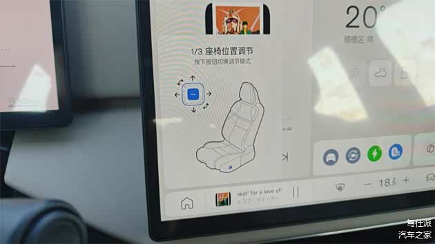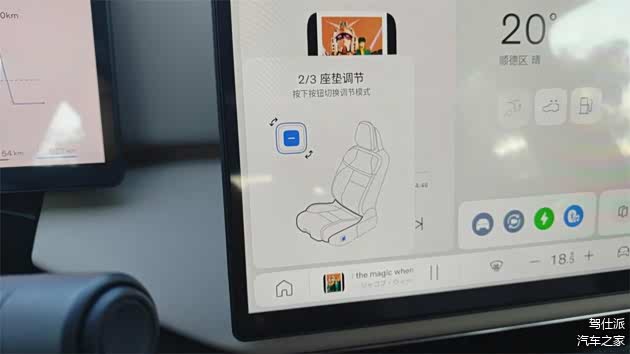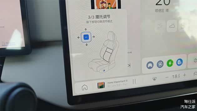 座椅的调节控件也设计得很有心思,一个简单而精巧的组件,就兼顾了座椅的所有调节维度。整个组件由中央的切换键,和外圈的摇杆组成。通过点击中央的切换键,就能切换座椅的位置、坐垫和腰托调节。外围的摇杆既能支持上下左右,也支持顺/逆时针的偏转,配合车机的指示也能很快上手。