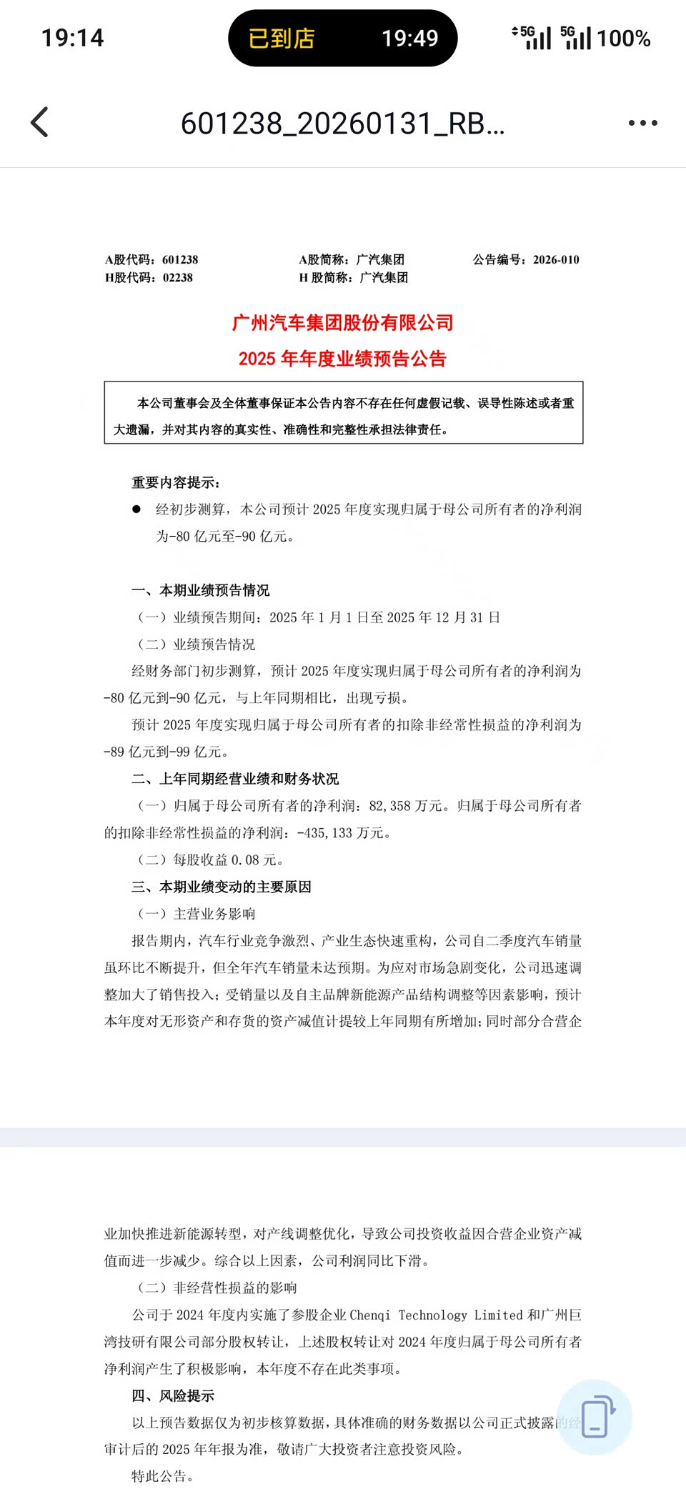 广汽集团公告了2025年年度业绩预告,概况如下: