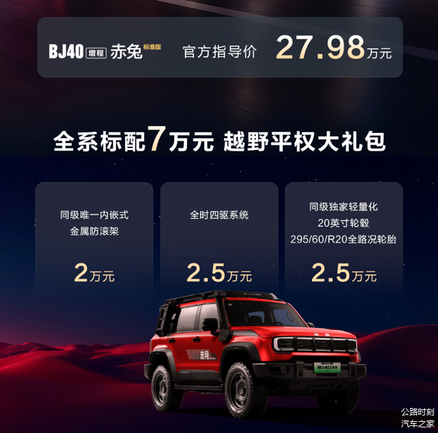 先说赤兔标准版。北京越野董事长王昊在台上的那句“能不能改得再帅、再潮一点”,其实翻译过来就是两层意思:一是BJ40的改装需求长期存在,二是“私改”在年检与合规之间反复折腾,成本和心力都不小。于是原厂改装、一步到位,成了这款车的核心卖点。赤兔标准版给出的官方指导价是27.98万元,同时把“价值7万元”的配置打包成所谓“越野平权大礼包”:同级唯一内嵌式金属防滚架(2万元)、全时四驱系统(2.5万元)、轻量化20英寸轮毂与295/60 R20全路况轮胎(2.5万元)。这些配置堆叠起来不算新鲜,但“原厂合规”这四个字,对目标用户往往比参数更有决定性。