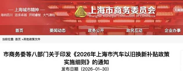 1月30日,上海市发改委、上海市财政局发布关于上海市贯彻实施2026年大规模设备更新和消费品以旧换新政策的通知。其中提出,支持汽车置换更新。