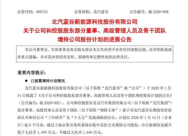 1月29日,北汽蓝谷(600733.SH)披露了高管增持计划的最新进展,引起业内外广泛关注。