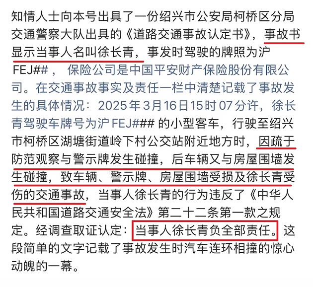 并且,认定书明确写道:事故由驾驶人徐长青负全责。