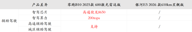 另外,在辅助驾驶方面,零跑B10配备激光雷达,支持高速城市领航辅助,而银河E5全系只有自适应巡航,辅助驾驶功能较单一,如果遇到跑长途的情况,零跑B10的领航功能要更省心一些。