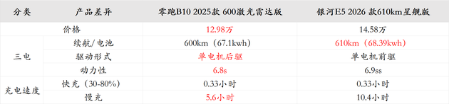 因此,在续航方面,银河E5比零跑B10多一二十公里,但前者慢充速度比后者慢了将近1倍,家用补能便利性差距明显。